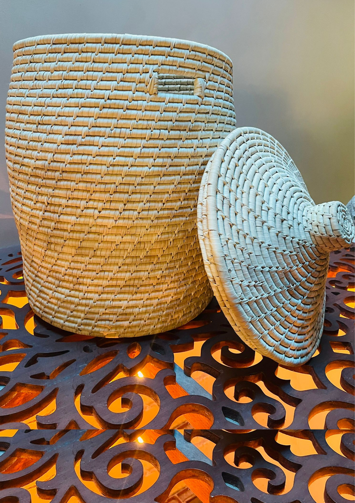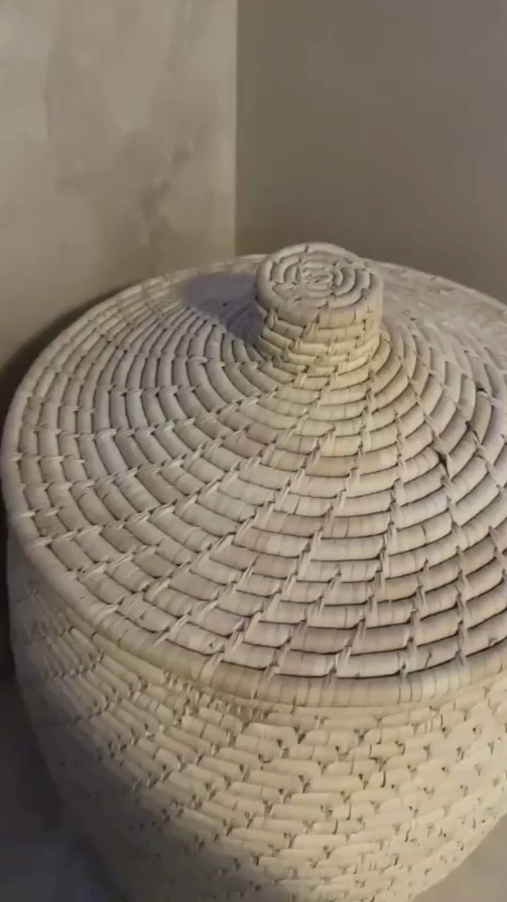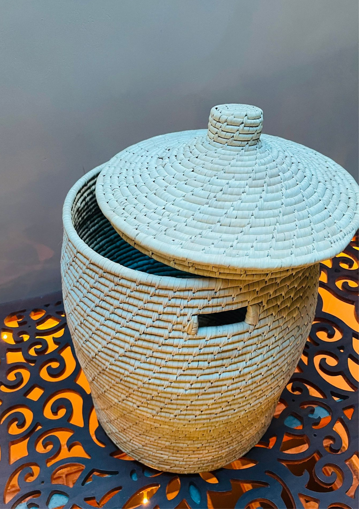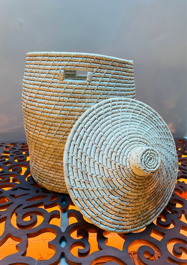 - HANDWOVEN DESIGN: Features tightly woven each and every Node, beautifully wrap with Dried Date Leaves and Covered with Lid.