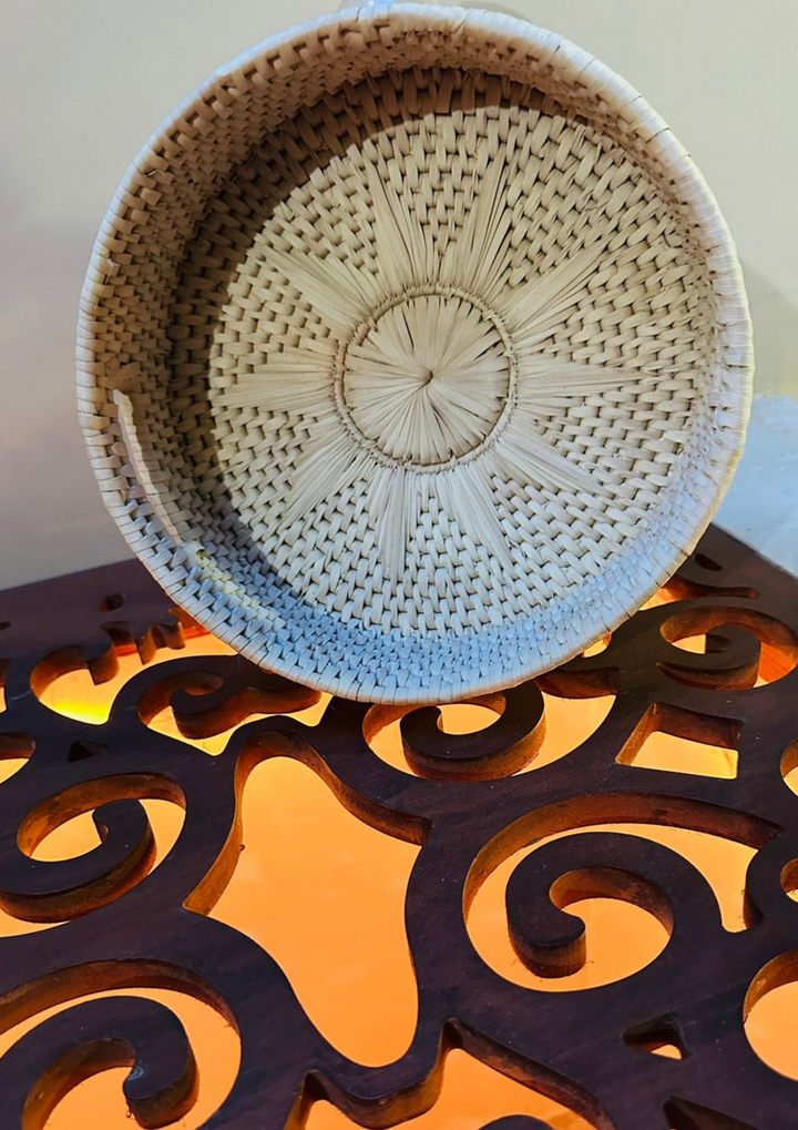 Hand Woven Dried date leaves basket with handles on either side, Round Serving Tray with Handles, Hand Woven Basket, Home Decor Organizer Tray for Breakfast, Tea, Snack, Fruit, Coffee, Storage (Medium)